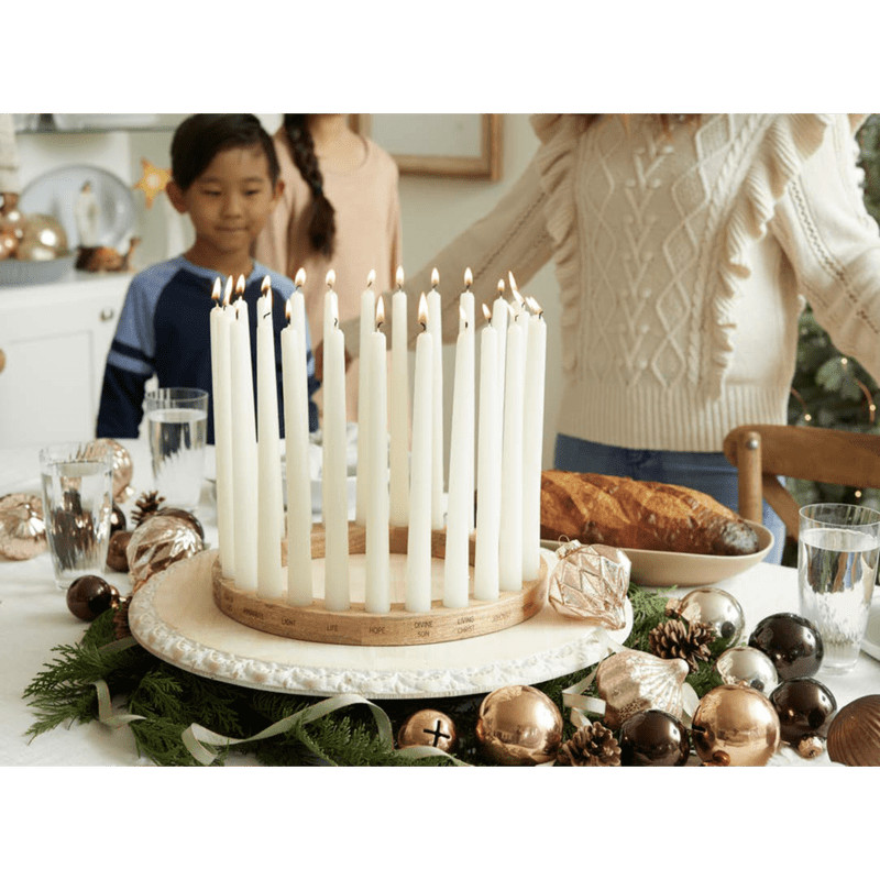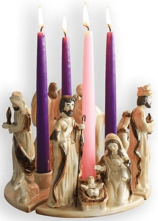 The Advent wreath forms the foundational layer of symbolism that is used to set apart the season of Advent from the rest of the year. Though traditionally it is a round wreath (which has its own symbolism) with four or five candles there is no one way to set up your advent “wreath”. All that is needed is four candles, one for each week, and an optional fifth candle for Christmas day. Whether it is a grouping if individual candlesticks, a special advent candelabra, or a homemade wreath of greenery – each Advent “wreath” is as unique and personal as the family that uses it.