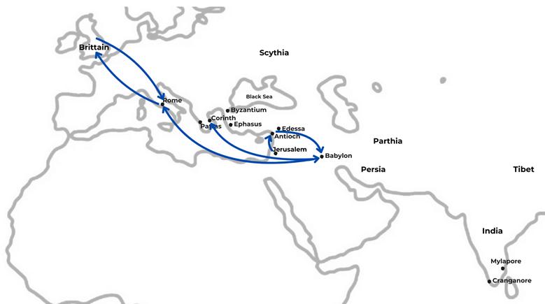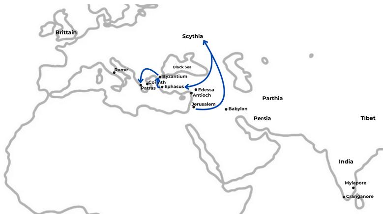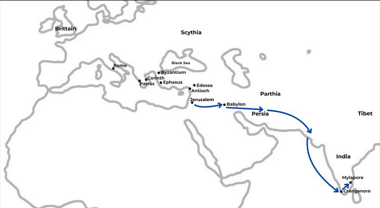 Thomas first appears in Northern India (modern Pakistan) where he converts the king Gondaforus. This king was believed to be legendary but his existence was proved when coins bearing his name were discovered. Thomas then likely traveled south down the coast, landing in Cranganore, after Gondaforus was defeated in war (about 45 AD). From there Thomas converted the three principal Emperors whose kingdoms made up the entire southern half of modern India, along with other high caste families. The church established by Thomas spread “like wildfire” through all of central Asia as far as Tibet.